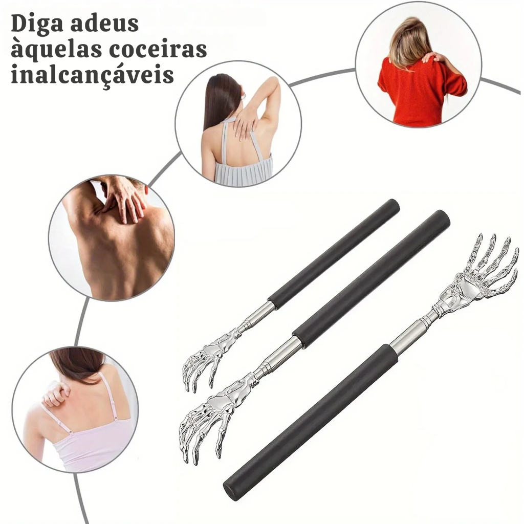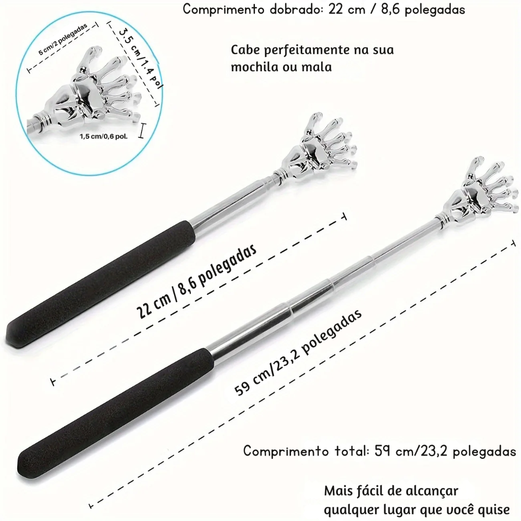 Combinando durabilidade e praticidade, este acessório possui um design telescópico que permite estender seu alcance, transformando-se de um item compacto de aproximadamente 16 cm em uma ferramenta de até 50 cm. Fabricado em aço inoxidável de alta qualidade, ele é resistente à ferrugem e projetado para não arranhar a pele, graças às suas pontas e garras arredondadas.